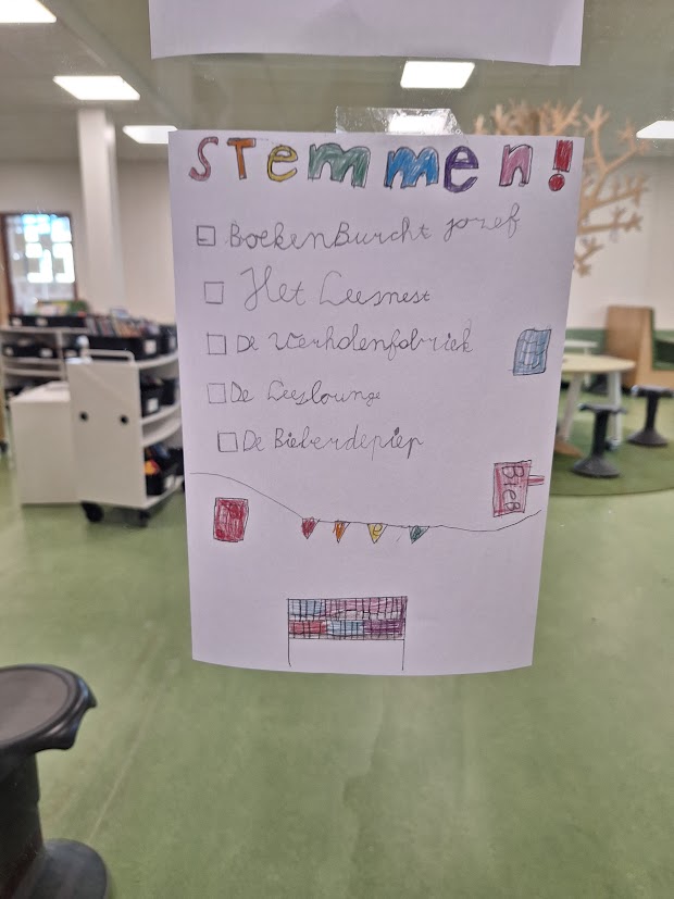 De keuze was niet makkelijk, de kinderen hadden de keuze uit: Boekenburcht Jozef, Het Leesnest, De Verhalenfabriek, De Leeslounge en Bieberdepiep. Net als bij de gemeenteraadsverkiezingen mochten de leerlingen stemmen met een biljet en een rood potlood. Onwijs spannend, want voor de meeste was dit de eerste keer stemmen. Na het stemmen mochten de leerlingen het briefje in de stembus doen.